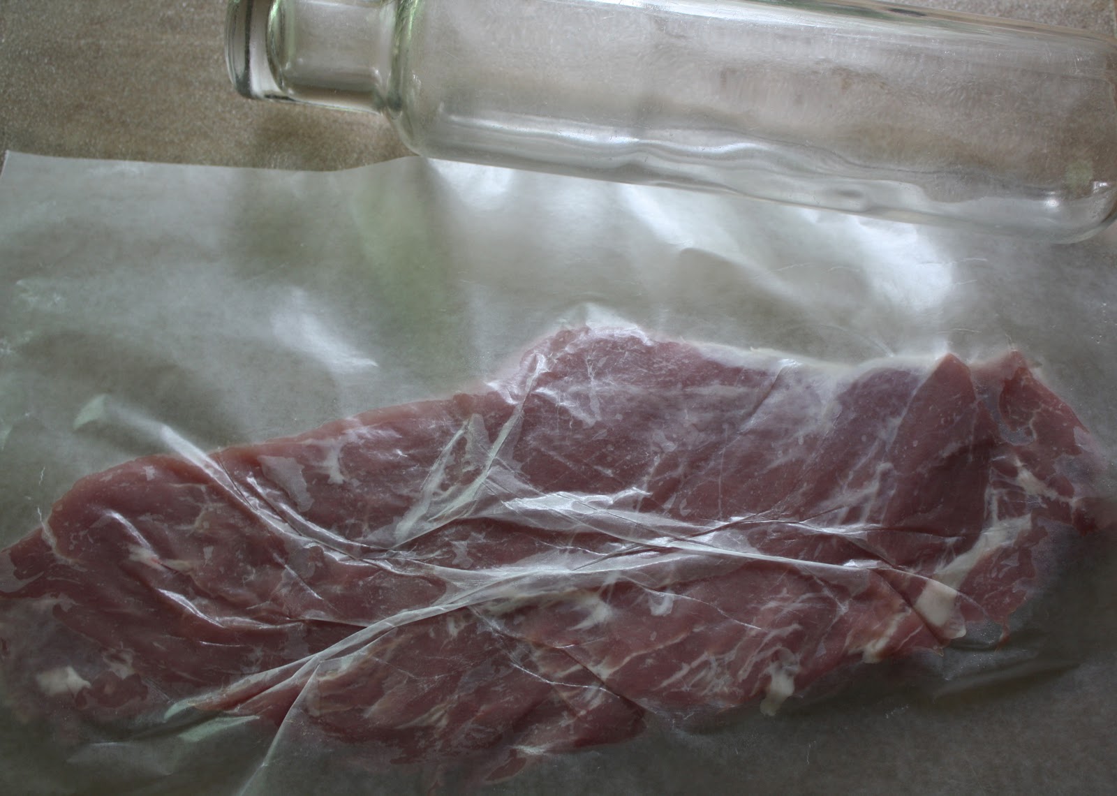 If your pork tenderloin is skinny, place it on a cutting board and pull out a meat hammer or a rolling pin. Cover the meat with wax paper and give the pork a thorough beating. Imagine that you need enough space to roll the pork with the filling inside. I believe I typically beat mine to the point where it expands 3-4 inches in size.