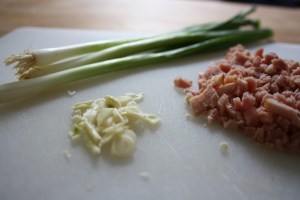 2. Cut up the ham and garlic clove (if you are using pancetta, begin sautéing it in a medium size pan).