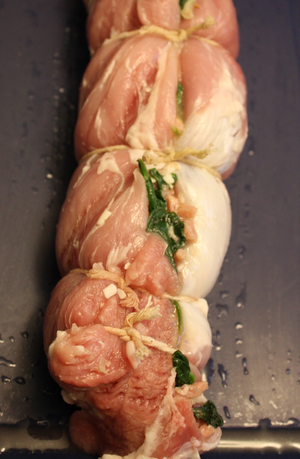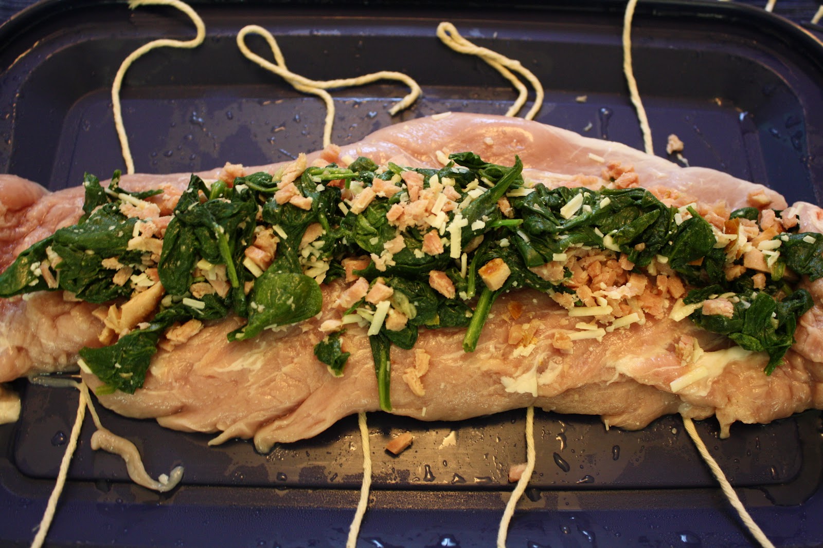 5. Place the pork loin on a flat surface. Place 4 or 5 strings underneath the meat. Each with enough length that they can easily tie in a double knot. Now spoon the spinach filler onto the middle of the meat.