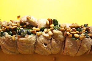 Cut into inch thick pieces and serve with pine nuts sprinkled on top…and don’t forget to cut the strings!