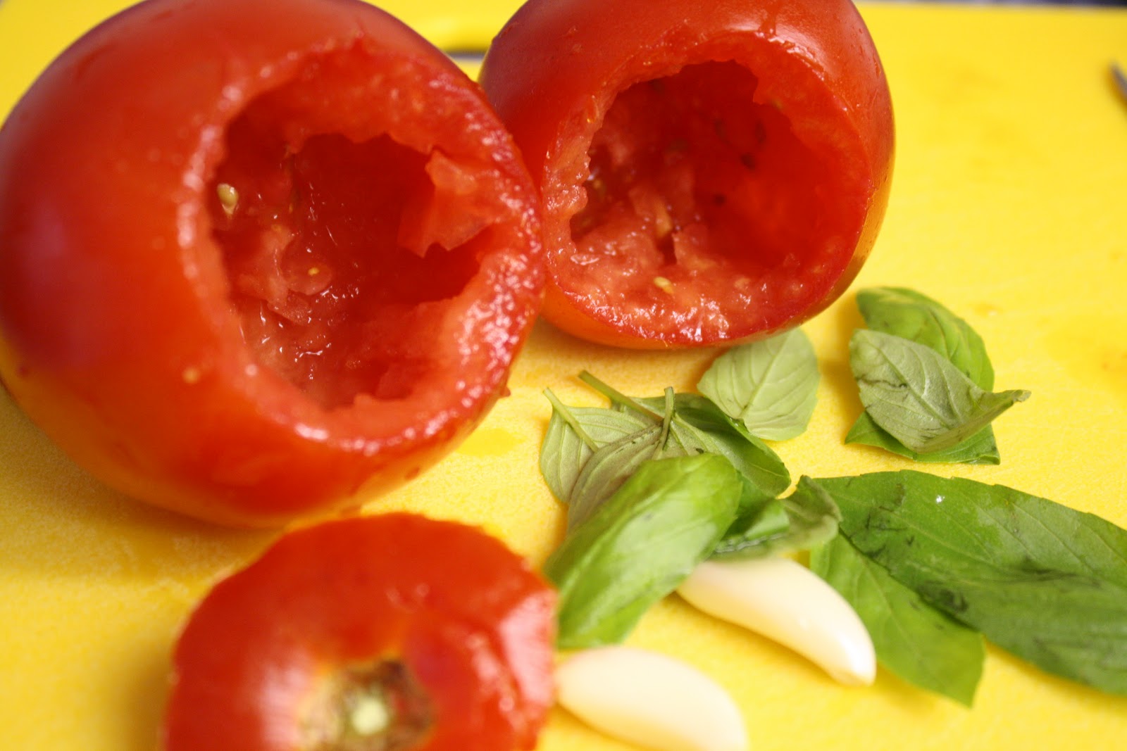 1.Begin making the tomatoes by cutting off the tops and hollowing out their centers. Place a sifter on top of a bowl and scoop the inside of the tomatoes into the sifter. You want to collect the tomato’s innards, but not the water. Discard the liquid