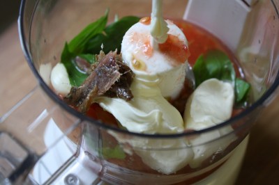 2. When you’re done, move the tomato pieces to your Cuisinart Mini-Prep Plus. Add the rest of your ingredients and hit the “grind” button and let it blend away.
