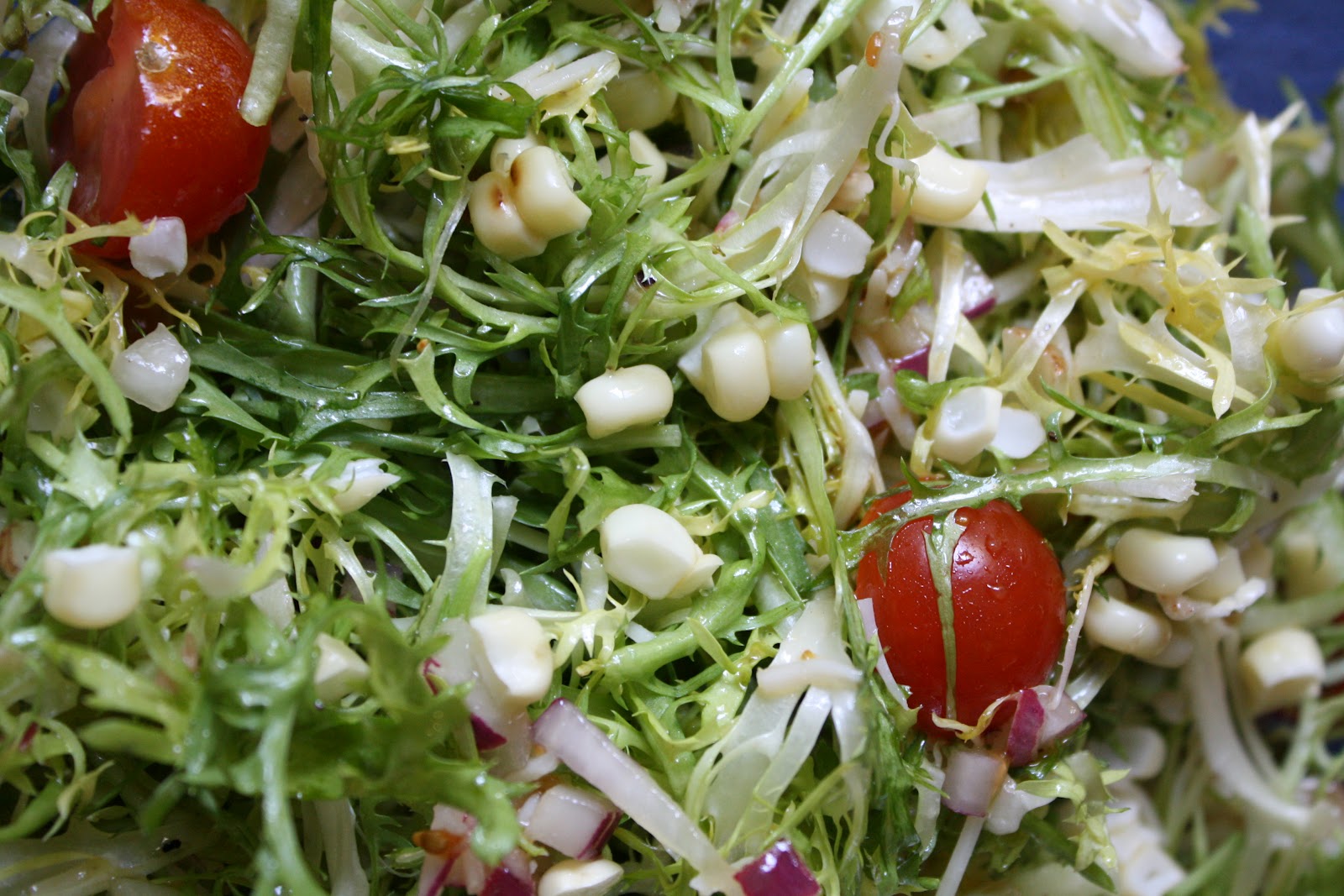 5. Make your salad. Put your frisée, tomatoes, red onion, corn, and Parmesan cheese in a salad bowl. Chop up your basil and add it right before your serve.
