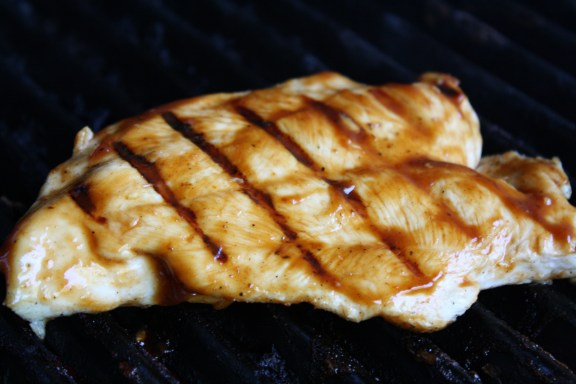 2. Heat your grill and begin grilling your chicken. Don’t throw away the excess BBQ sauce that the chicken was marinating in, you’ll use that to baste your meat as you cook it. I typically cook my chicken breasts at medium heat for 12-15 minutes total. 6 minutes on one side, and then the next, basting in between. Every grill is different, use your best judgement. Your goal should be to keep your chicken juicy and tender, but avoid a pink center. Be careful, undercooked chicken can lead to salmonella.