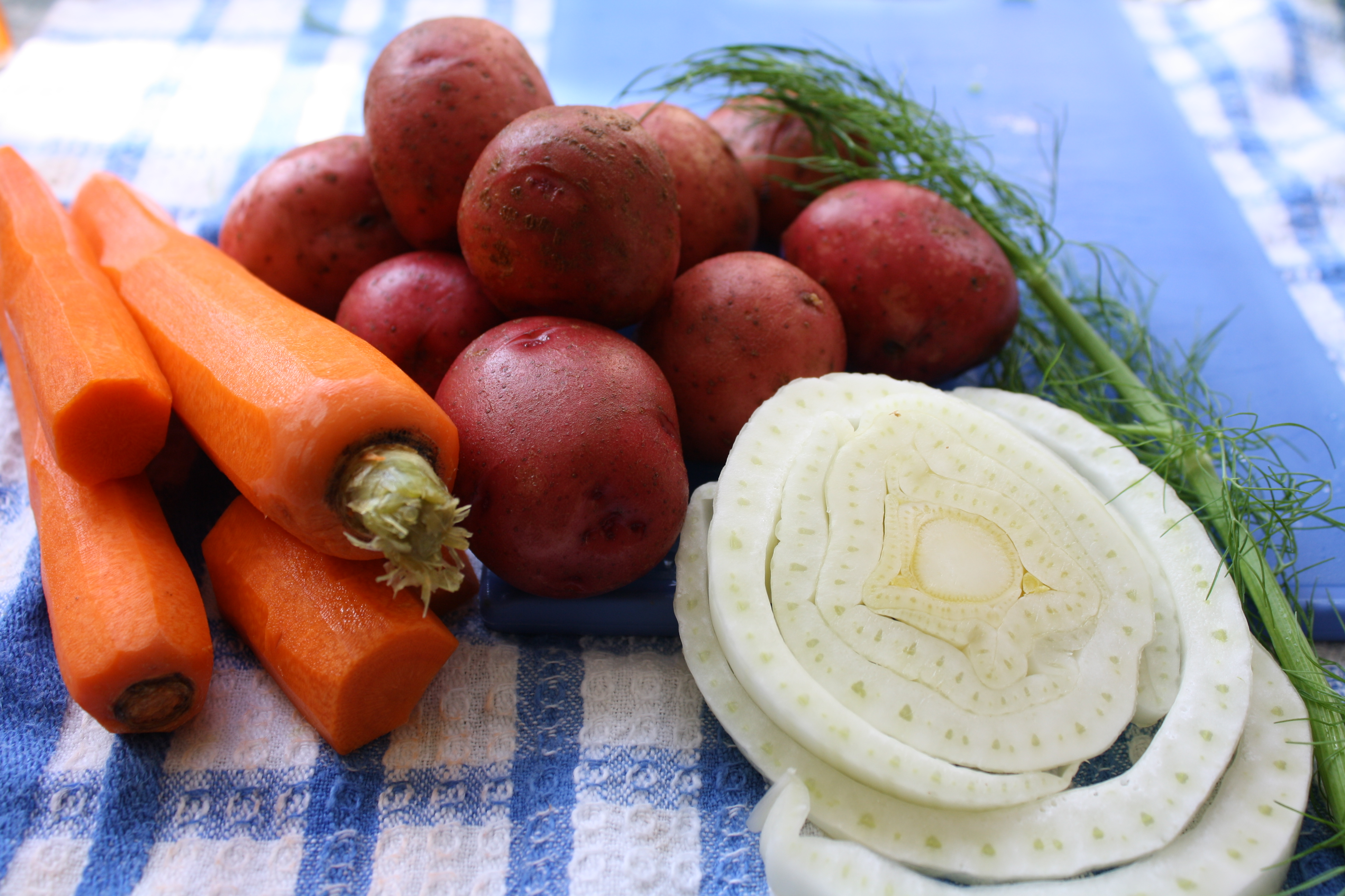 3. Place your carrots, fennel, onions, garlic, and potatoes in the pan (use one with 3 inch sides) and pour your olive oil on top. Mix them together so that the oil gets on everything. Add more oil if the veggies didn’t get enough. You don’t want them swimming in oil, but oil just keeps them from drying out. Sprinkle them with salt and pepper. Now add in your orange and lemon sections.