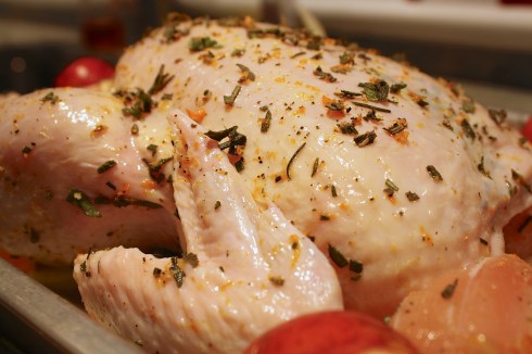 2. When done brining, begin covering your chicken in the rub you’ve prepared. Use your (clean!) fingers to do this. And don’t be shy, if you can get underneath the skin – do it, it’ll help the flavor. Preheat your oven to 375. Use an oven safe thermometer to regulate the temperature of your chicken while it’s cooking. (When I made this I undercooked parts of the bird. This is never fun because undercooked chicken makes everyone nervous, especially the cook! Do yourself a favor, invest in an oven safe thermometer).