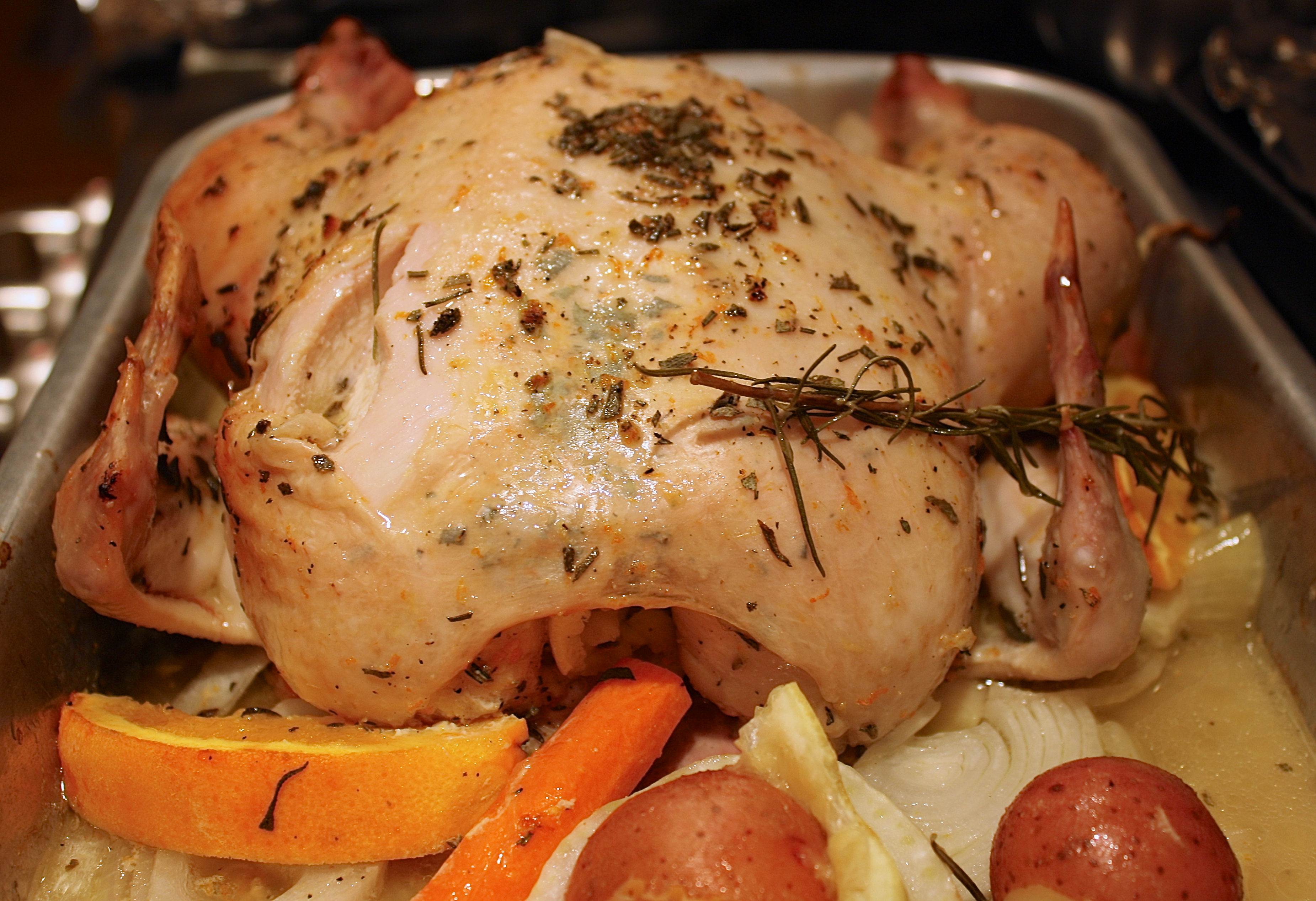 5. Now place your thermometer in the chicken and place the pan in the oven. Put your timer on for 1 hour or less (depending on the size of your bird). I think this is a helpful website for learning the ins and outs of roasting chicken. Remember it may take a few extra minutes to cook your bird if you are also cooking veggies.