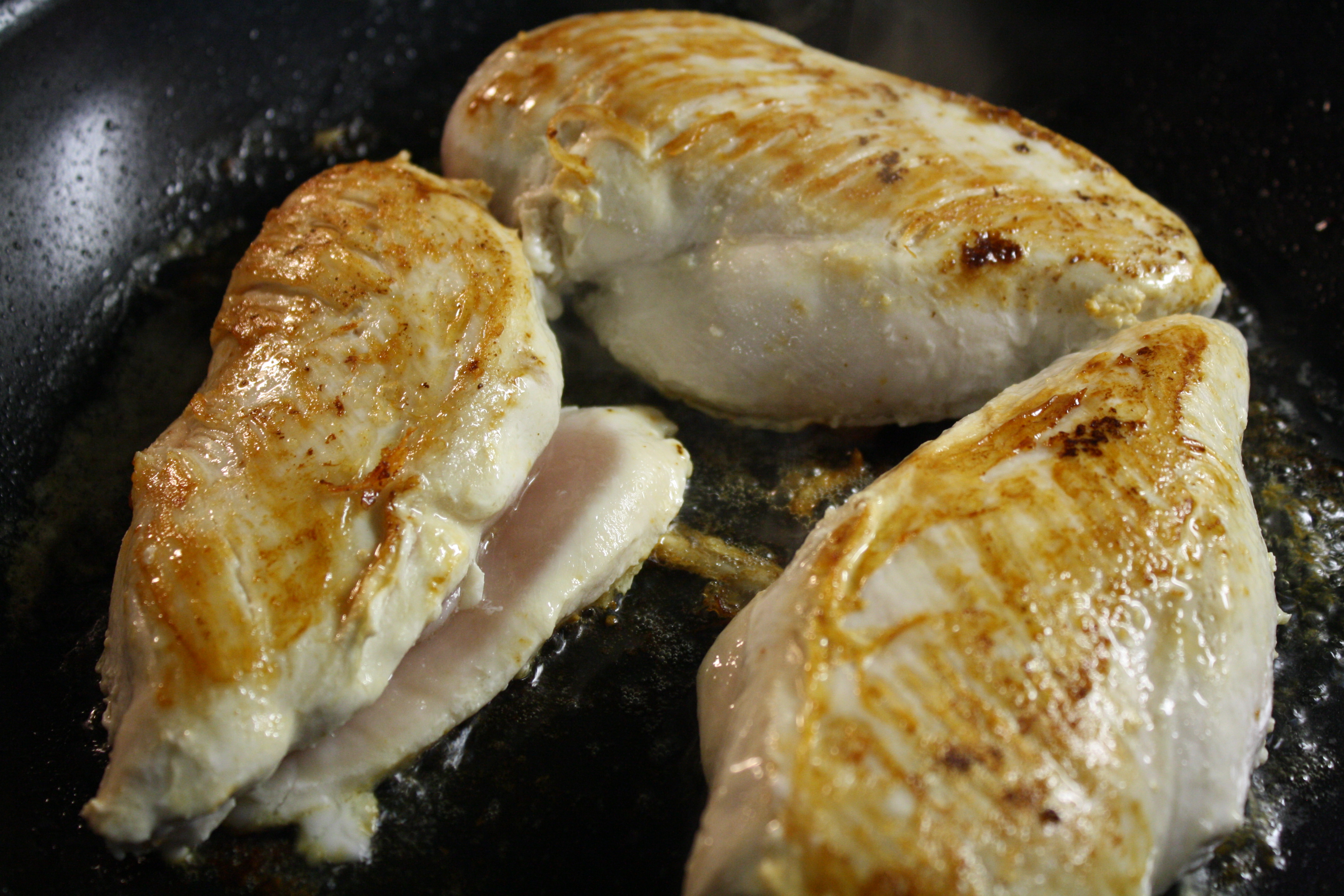 2. Melt 3 Tbps of butter in a non-stick large frying pan. Make sure the butter evenly coats the pan. Now add your chicken breasts and turn the heat to medium high. You want your chicken to get golden on the outside like in the photo below. After about 2-3 minutes flip your chicken to the other side. Cook and then remove. Remember, your goal is to get a golden brown color on the outside, but you are not aiming to cook the whole piece thru, you’ll do that later.