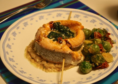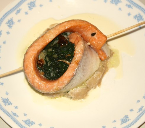 1 Long 1 lb piece of salmon cut in two longways (Note: I’d recommend about 2 lbs for 4 people, so if you can get a 1 lb piece that’s at least 10- 12 inches in length you should be good. It needs to be long enough that you can wrap it around a small pile of spinach. The ends don’t have to overlap, but that’s the way you get your best shape. See below photo).