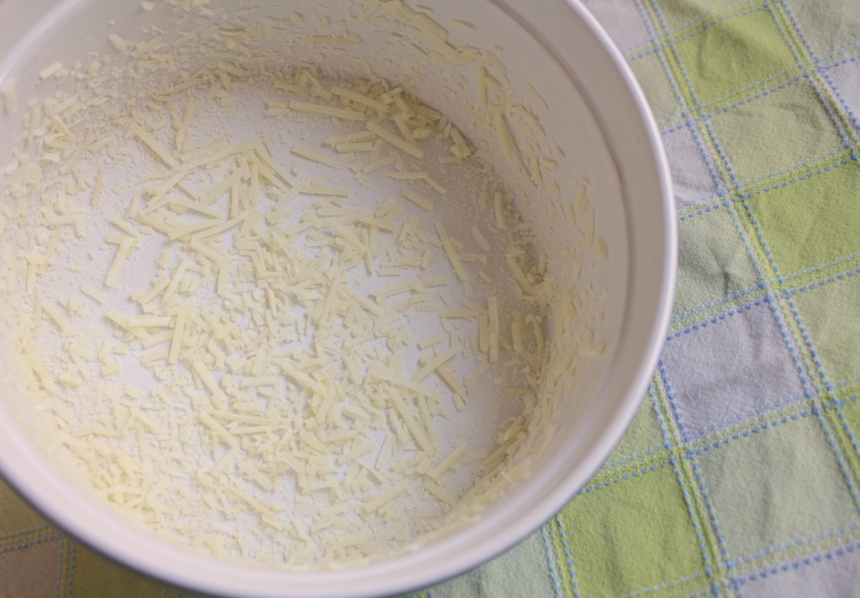 2. Preheat your oven to 400 degrees. Butter your casserole dish. Take your Parmesan and sprinkle it into the dish, turning it to ensure that the cheese covers all the different sides – see photo.