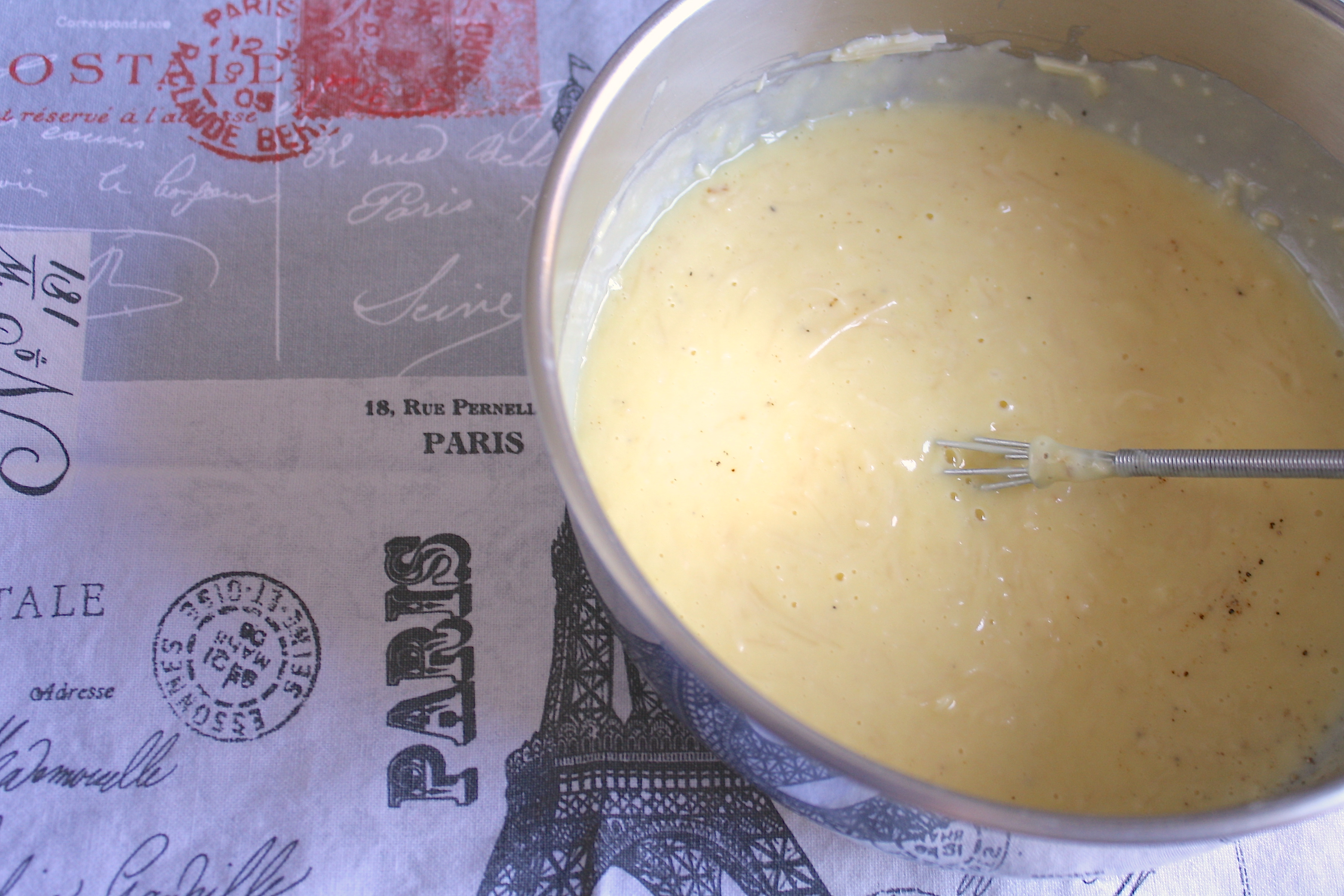 1. Take 3 Tbsp of your butter and melt it in a small saucepan. Add the flour slowly while mixing and heat at medium heat for 3 minutes. Pour in the hot milk and whisk together on high heat for about 5 minutes – when the mixture boils remove it from the heat. In a separate bowl beat your egg yolks. Now pour the egg yolks slowly into the hot milk mixture (while whisking). Move it from the sauce pan into a large bowl. Add your gruyere cheese, nutmeg and a sprinkle of salt and pepper and mix it all together.