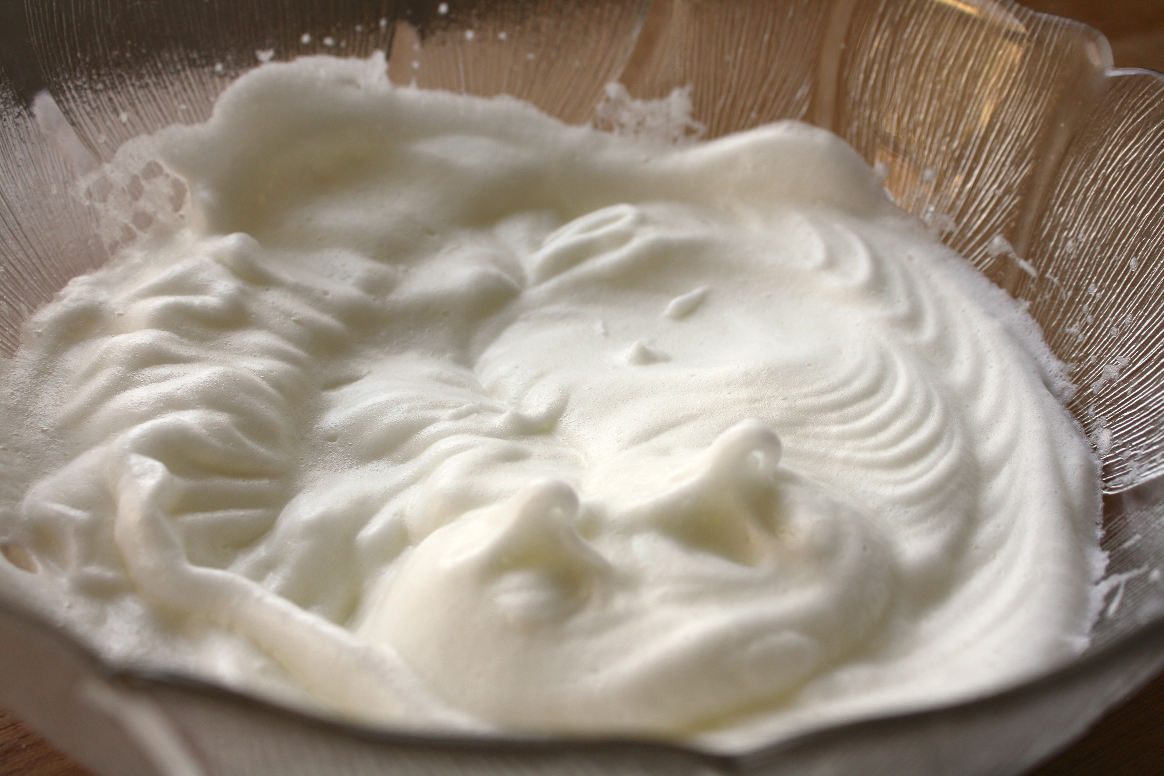 3. Put your egg whites into a large mixing bowl, add the cream of tartar. Mix the egg whites until they are firm – see photo.