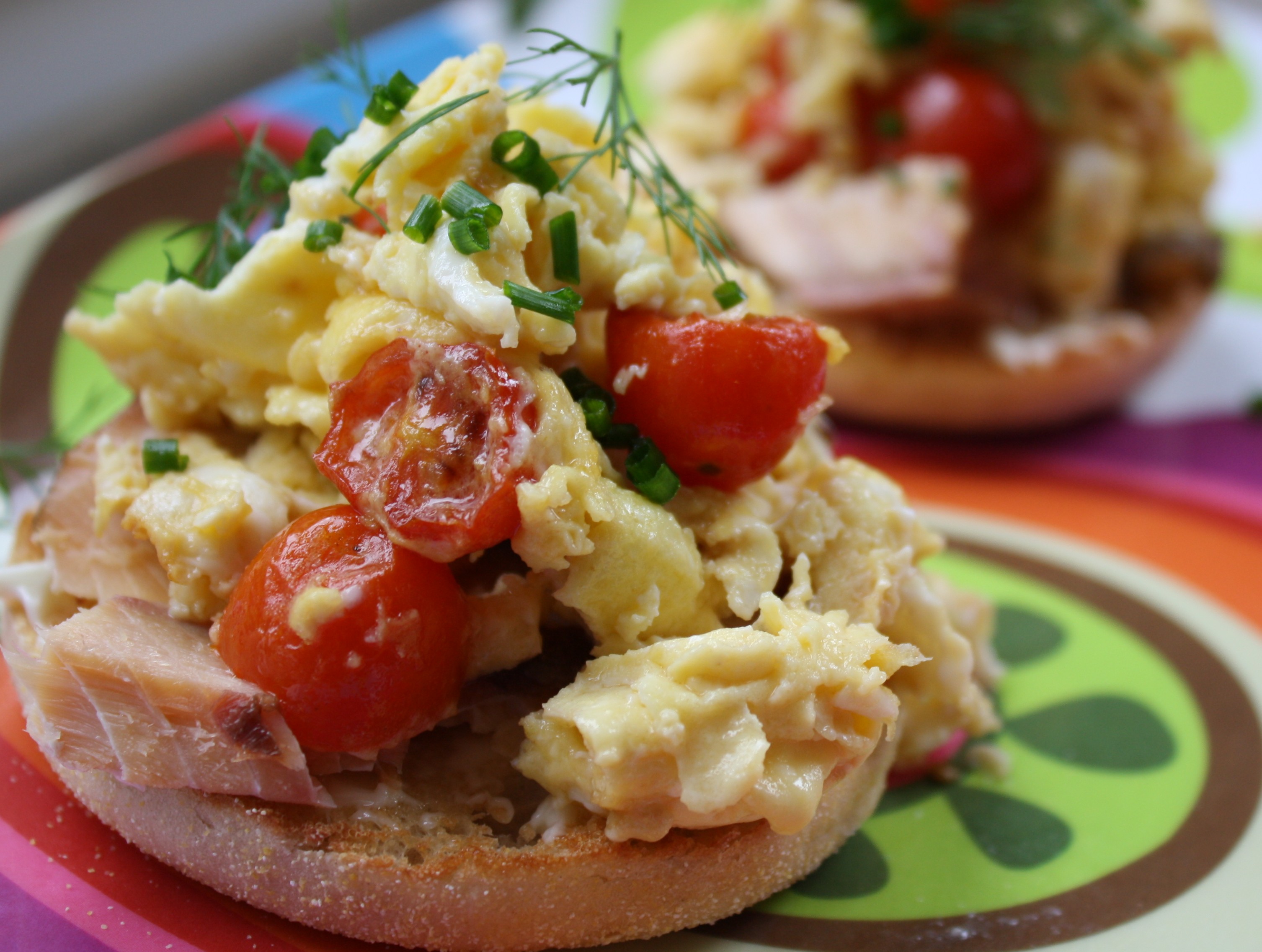Place your desired amount of smoked fish on the English Muffin, put your scrambled eggs on top. Sprinkle with chives and dill and enjoy.