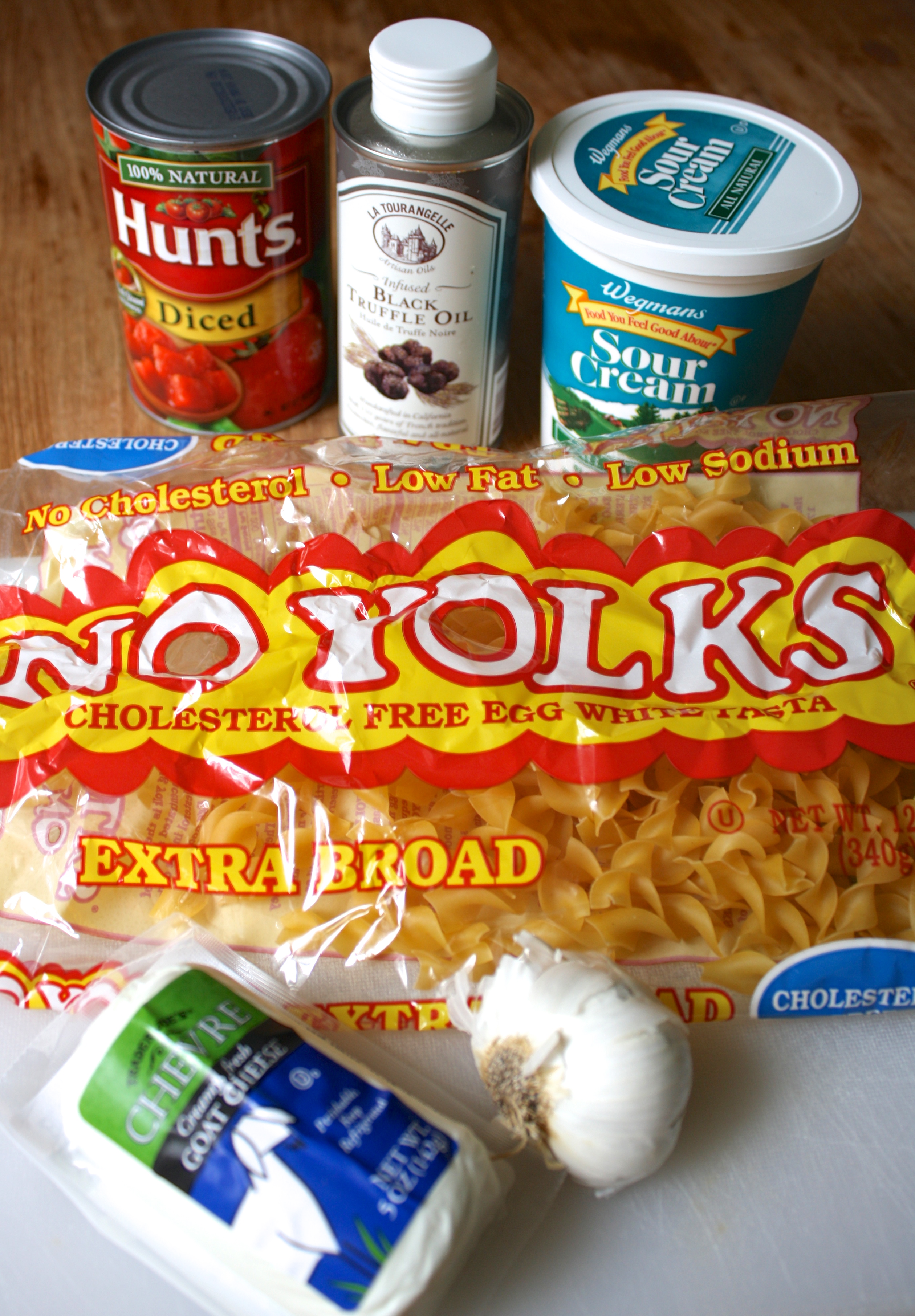 3. While your noodles are cooking, mix the goat cheese with 2 Tbsp sour cream and garlic cloves so things are well blended. When the noodles are done cooking, and remain hot/warm, spread the cheese garlic mixture in with the noodles in a pyrex dish (9×9 should be fine – but feel free to make it in a bigger dish if you like).