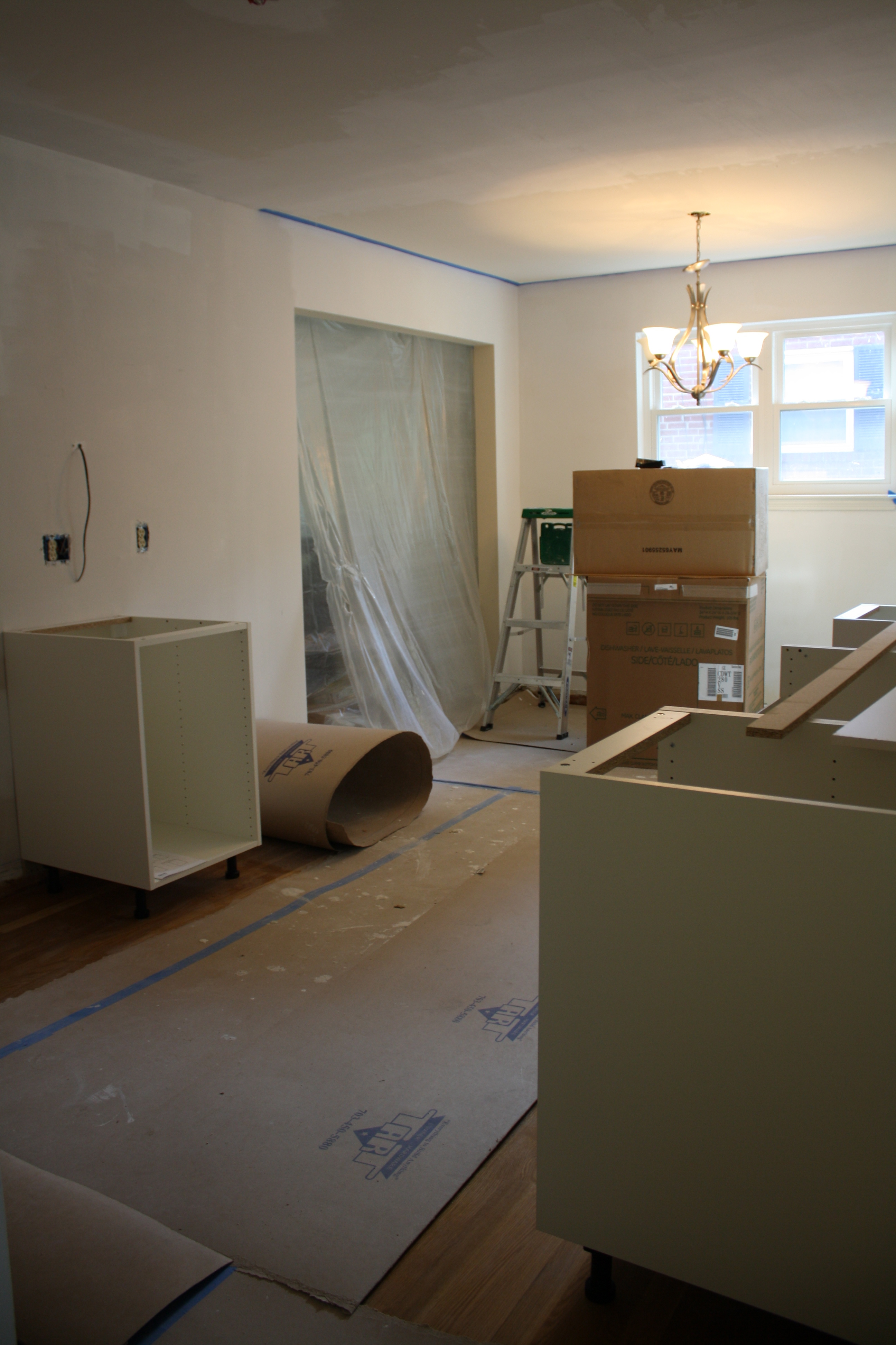 The new floors are in and with the removal of the dining room wall, our kitchen has almost doubled in size! Look closely and you’ll notice our new hardwoods.